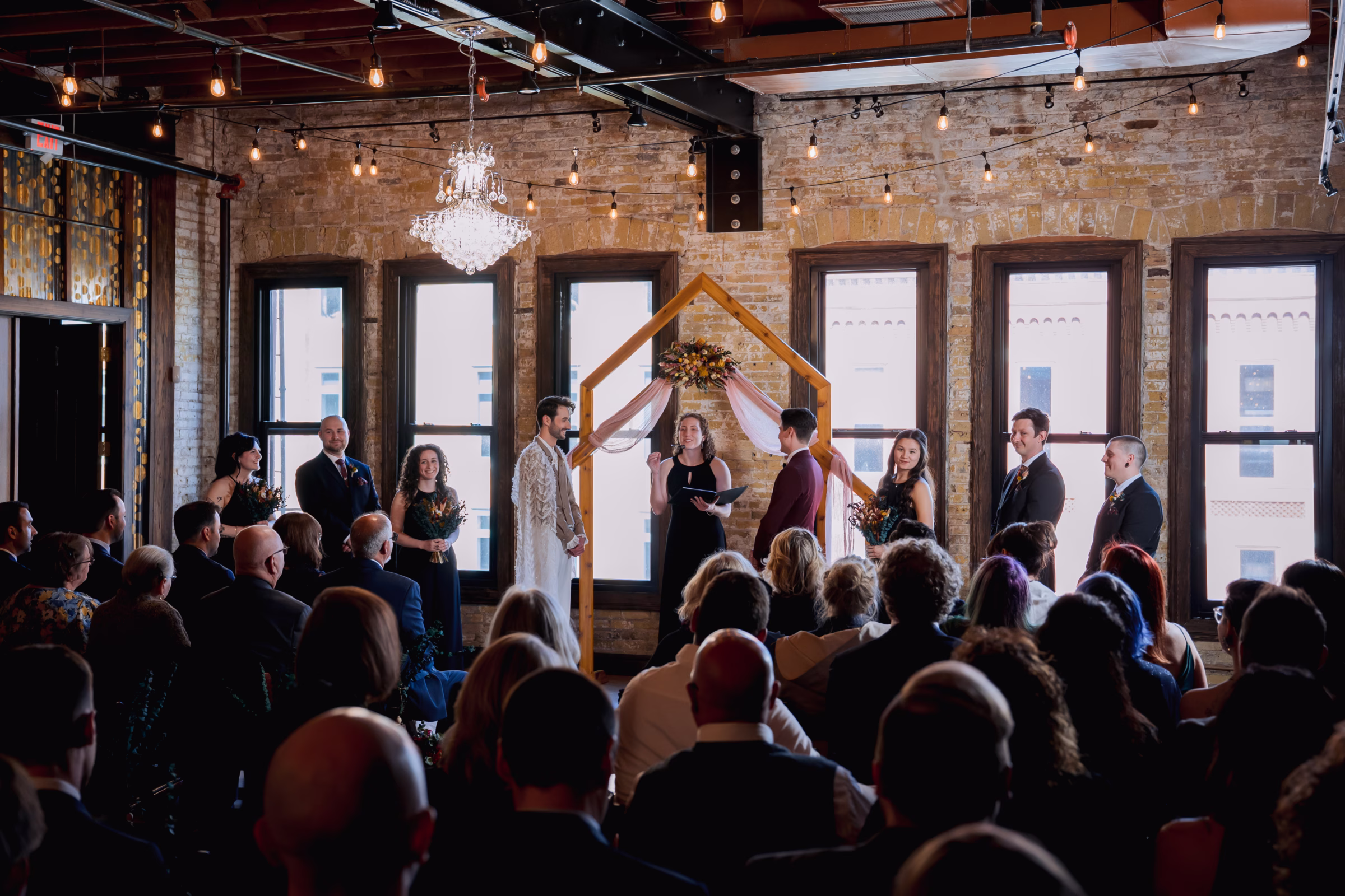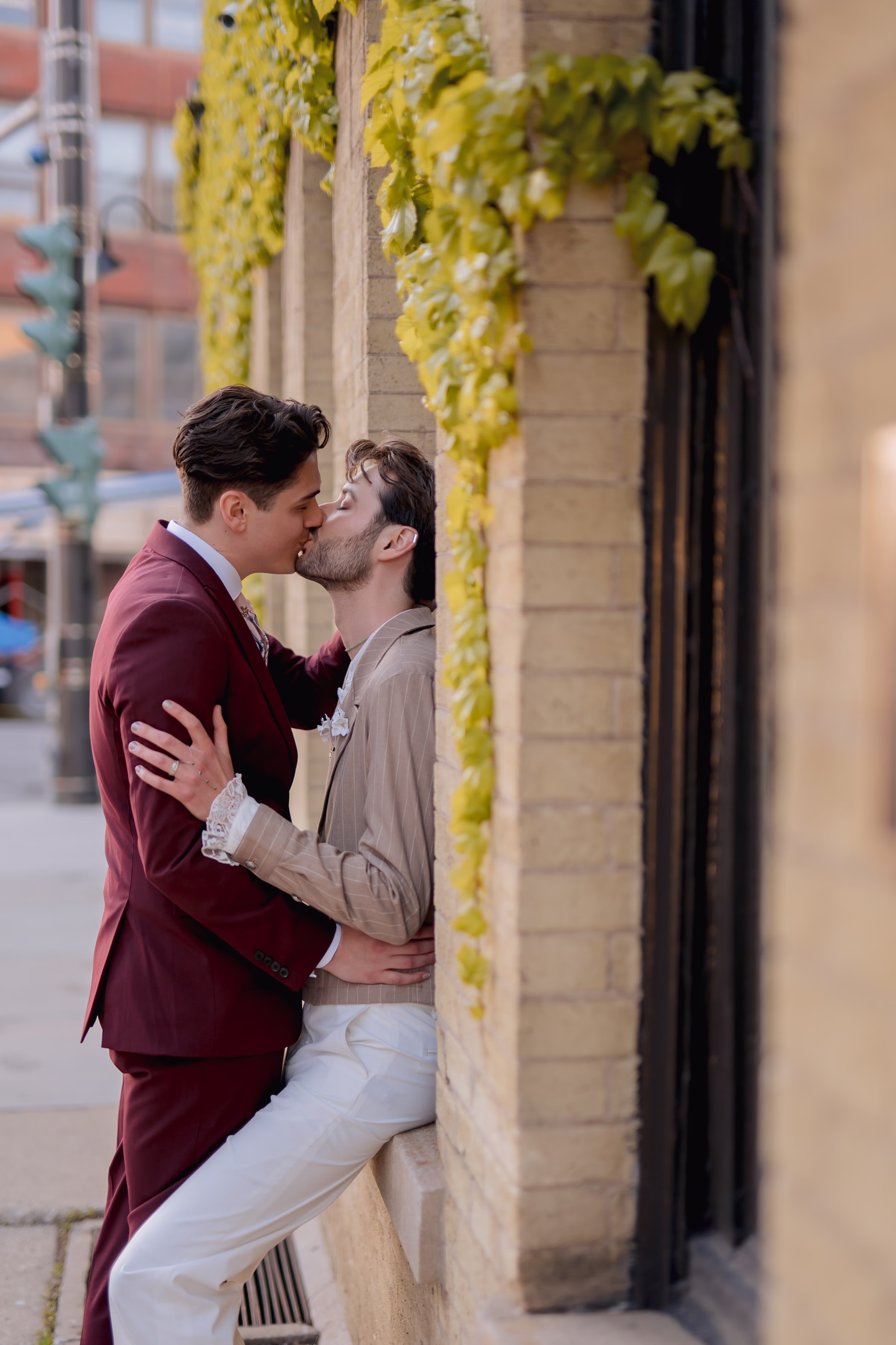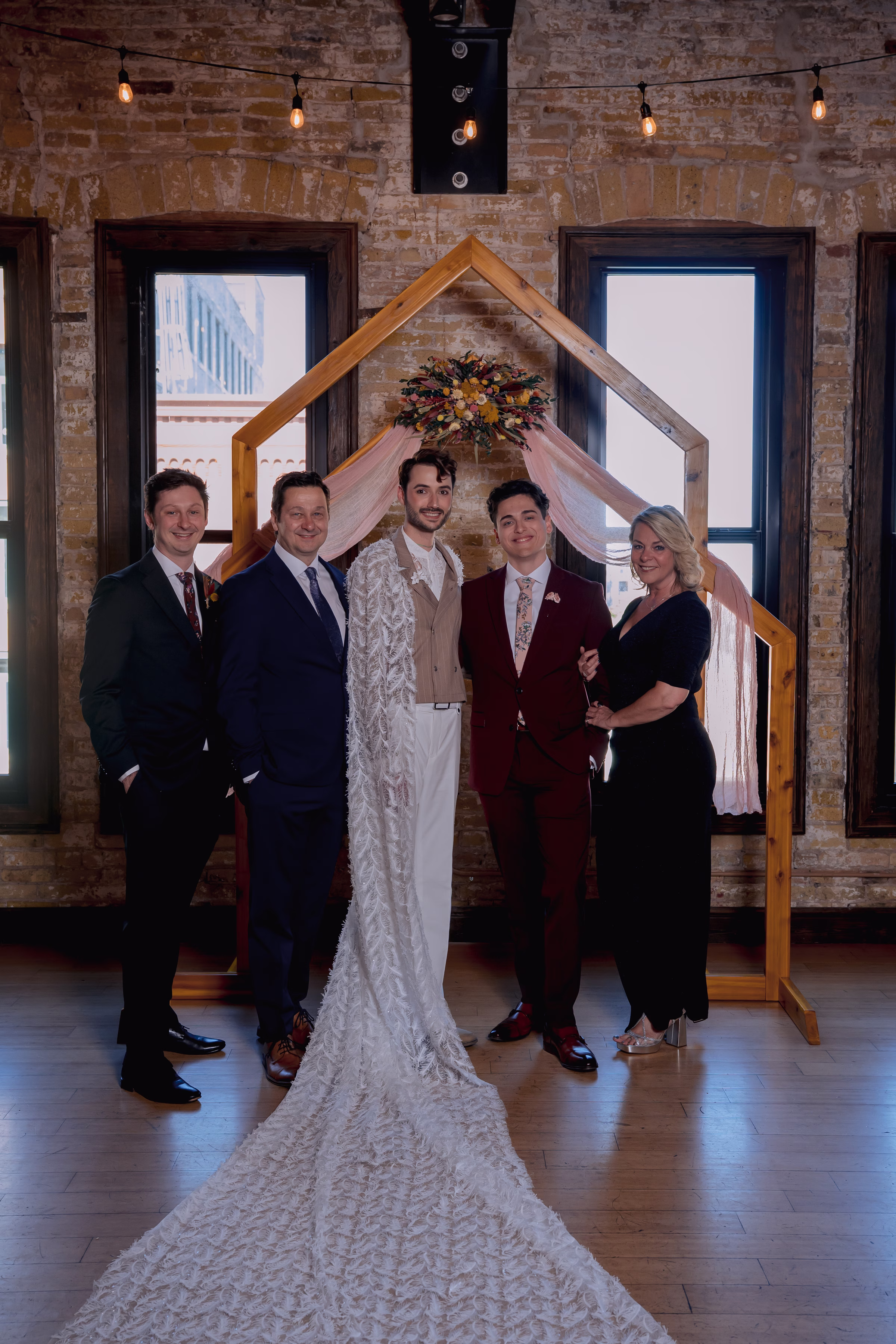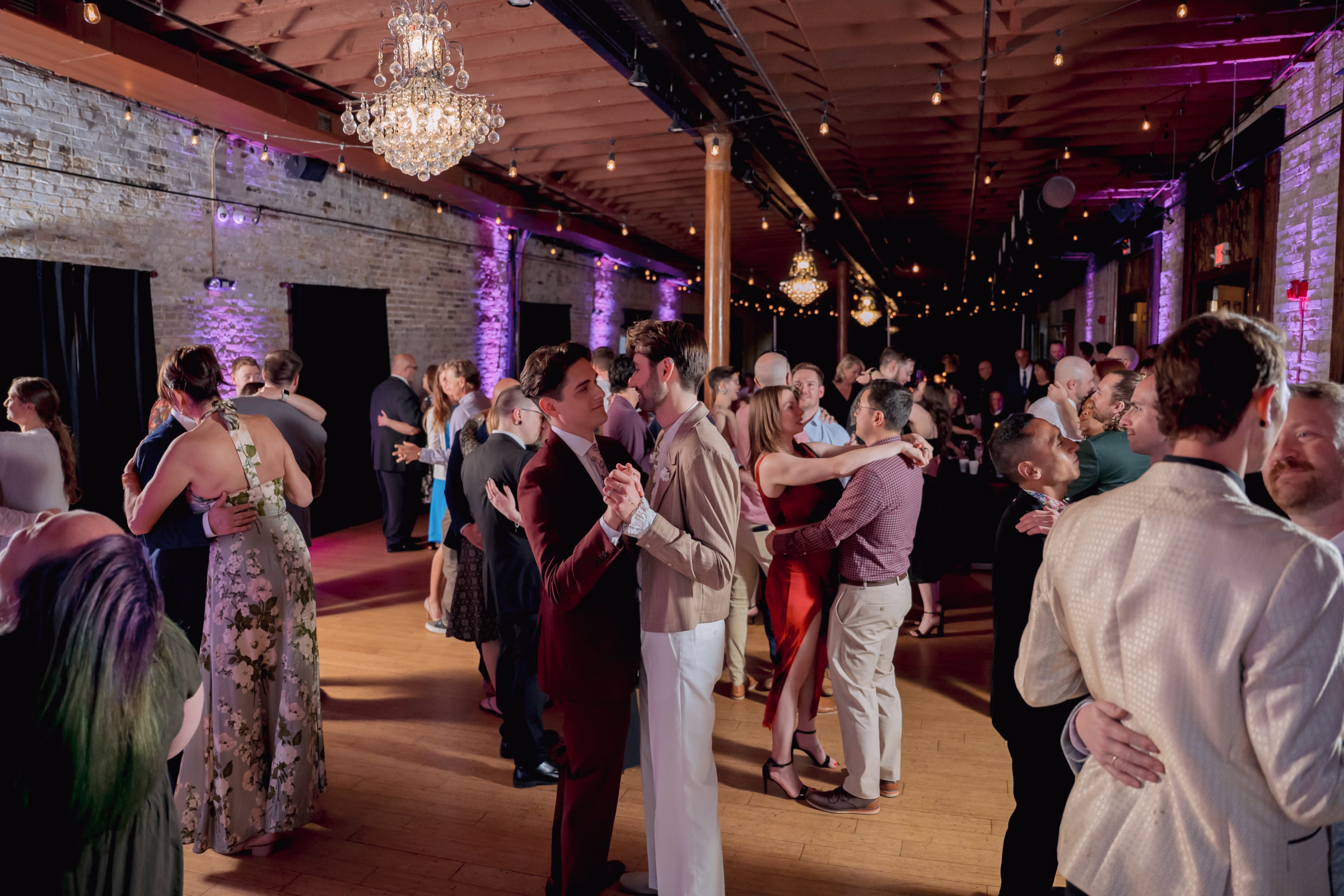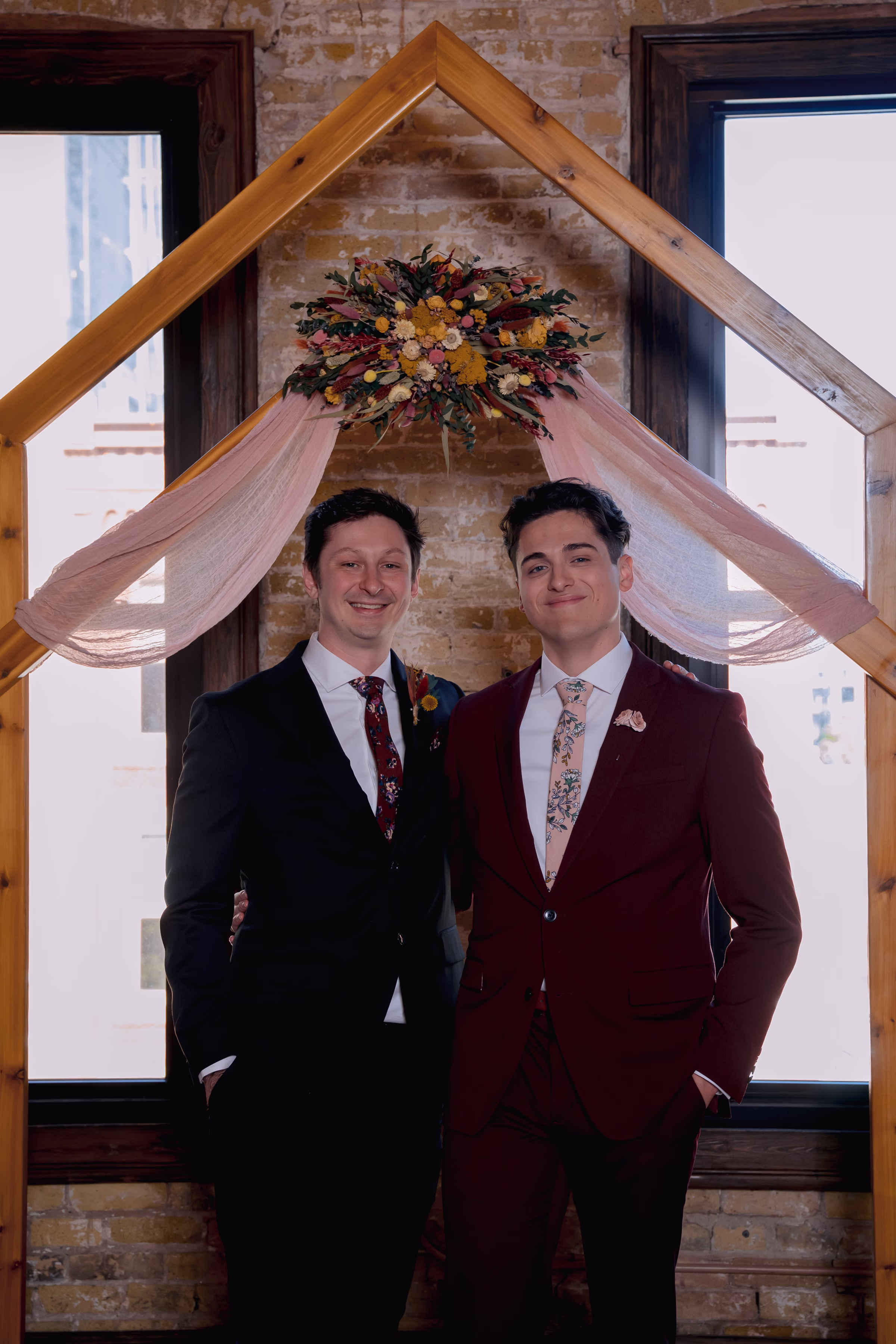 The wedding vision leaned vintage with wildflower elements and a subtle sense of drama, centered on a palette of ivory, tan, blush, and maroon. Tony and Jake chose The Loft on Broadway, a venue located in Milwaukee’s Historic First Ward, for their special day. The vintage, renovated industrial venue boasts large windows, high ceilings, wooden beams, and distinctive cream-city brick, making for a cozy space with cityscape views.