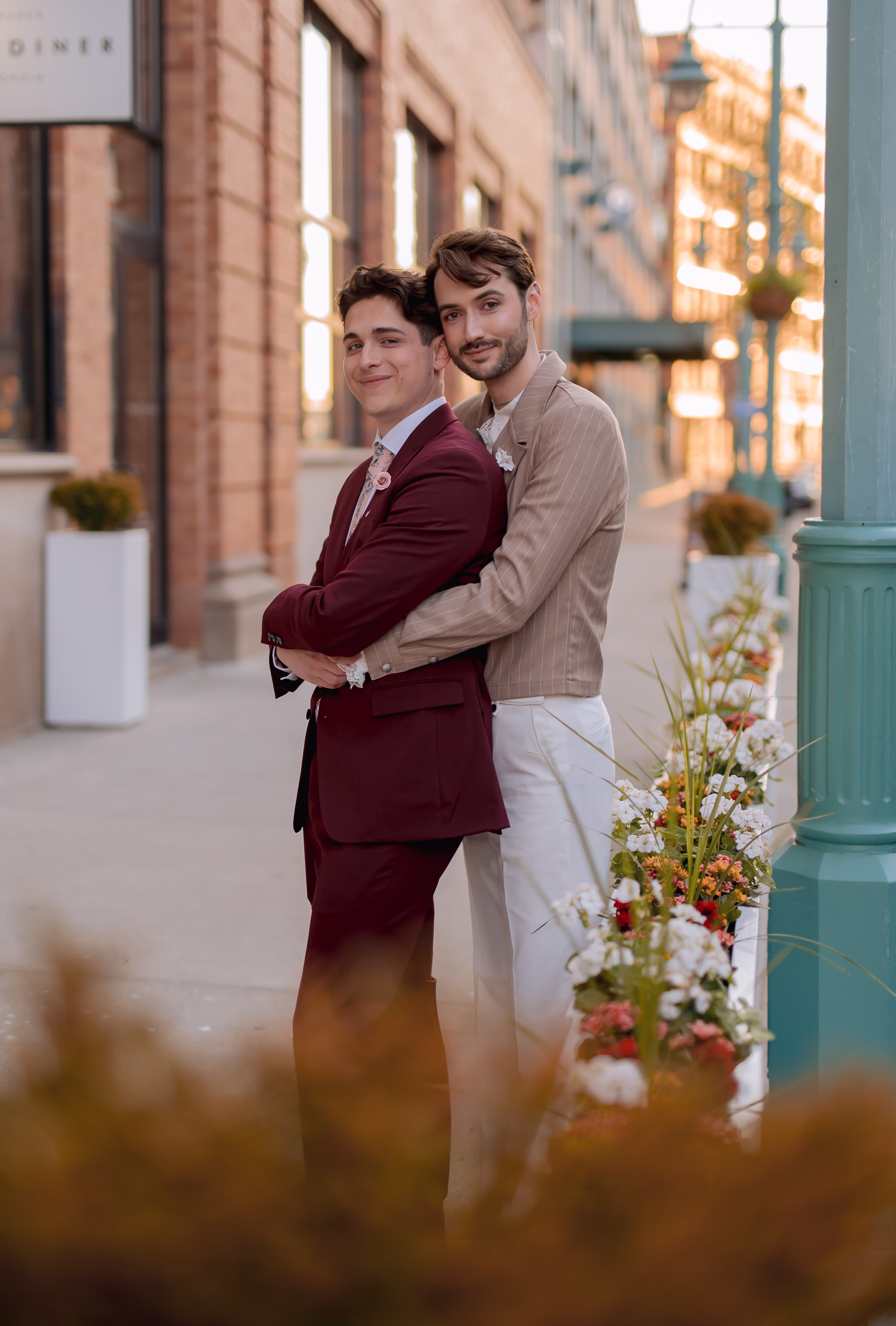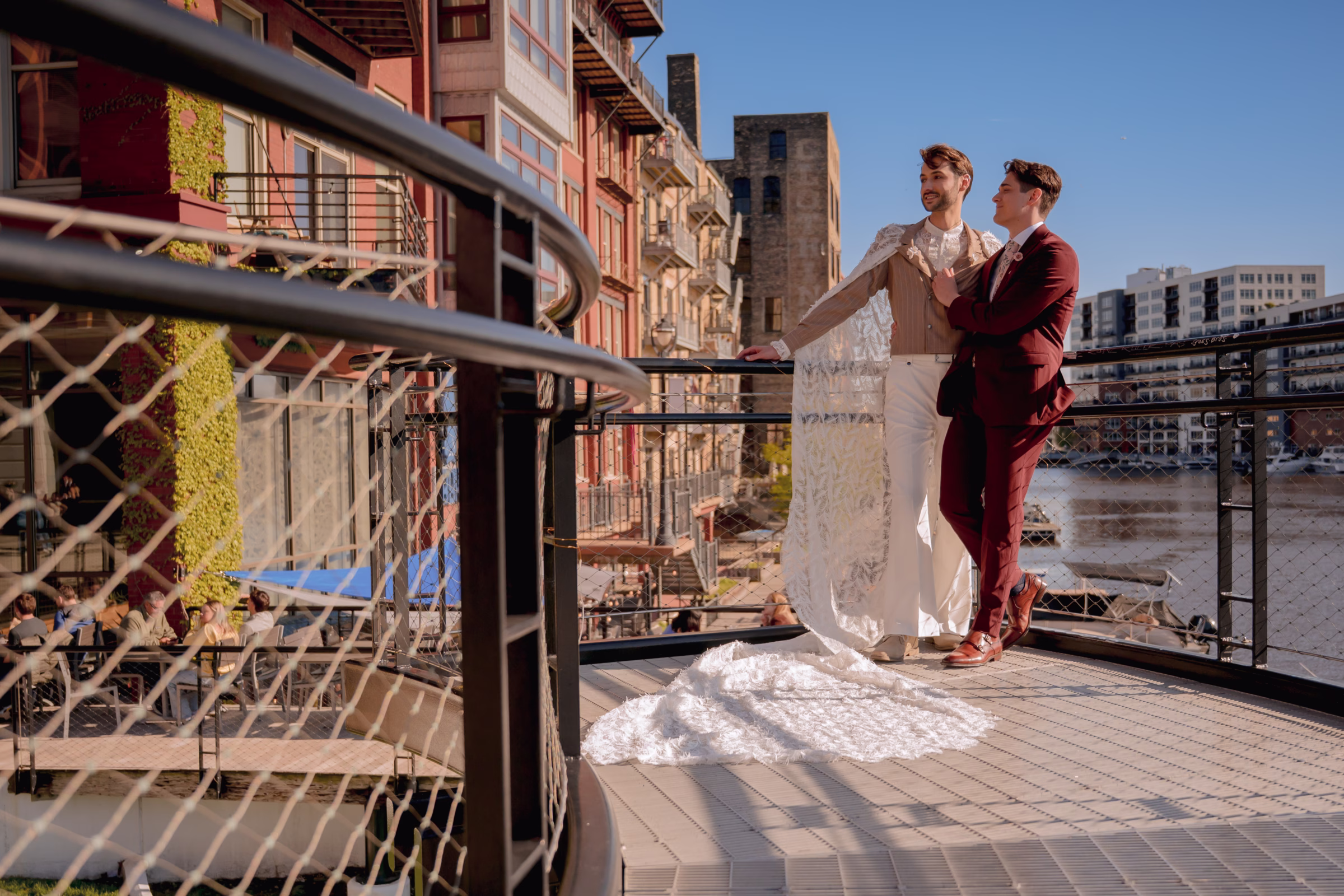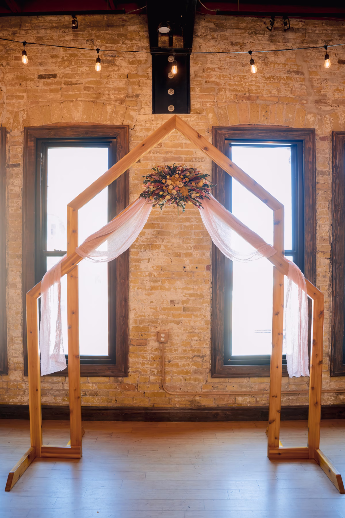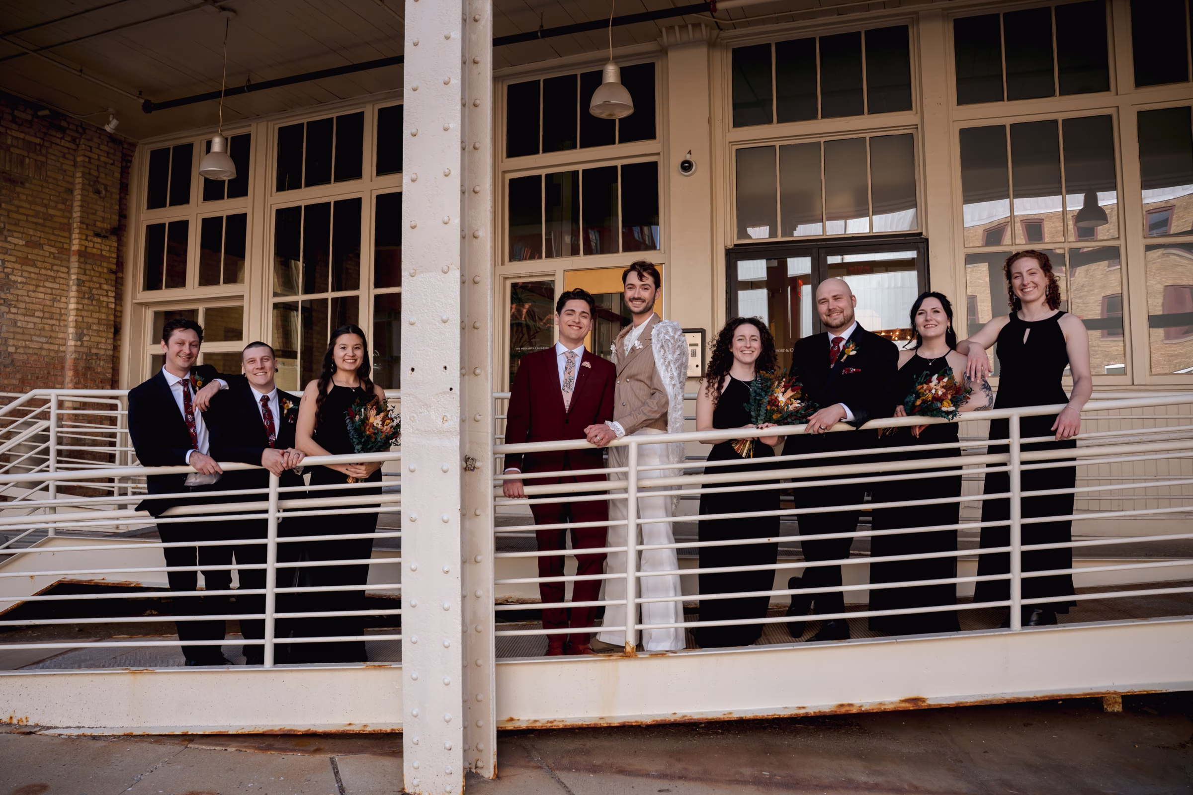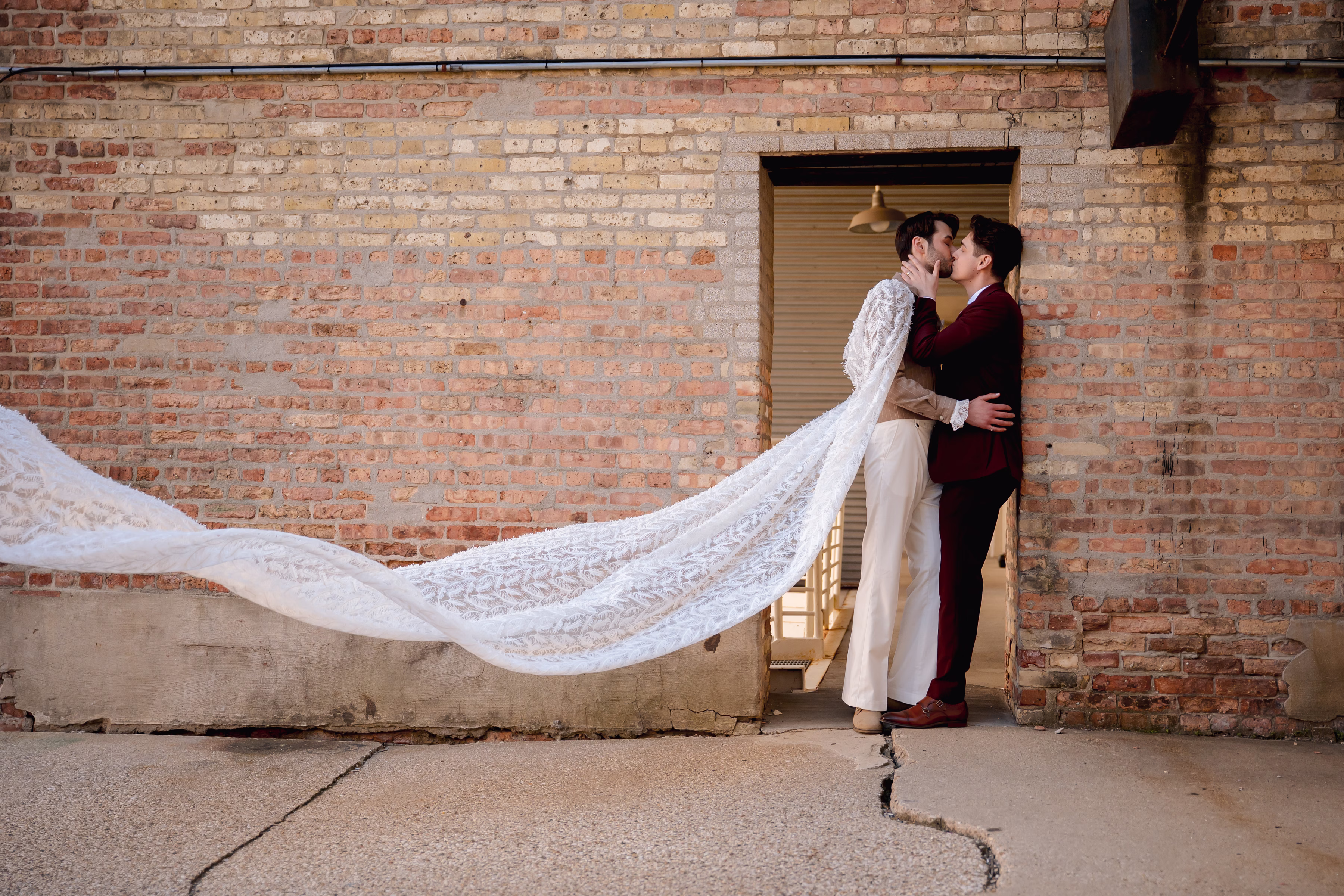 The wedding vision leaned vintage with wildflower elements and a subtle sense of drama, centered on a palette of ivory, tan, blush, and maroon. Tony and Jake chose The Loft on Broadway, a venue located in Milwaukee’s Historic First Ward, for their special day. The vintage, renovated industrial venue boasts large windows, high ceilings, wooden beams, and distinctive cream-city brick, making for a cozy space with cityscape views.