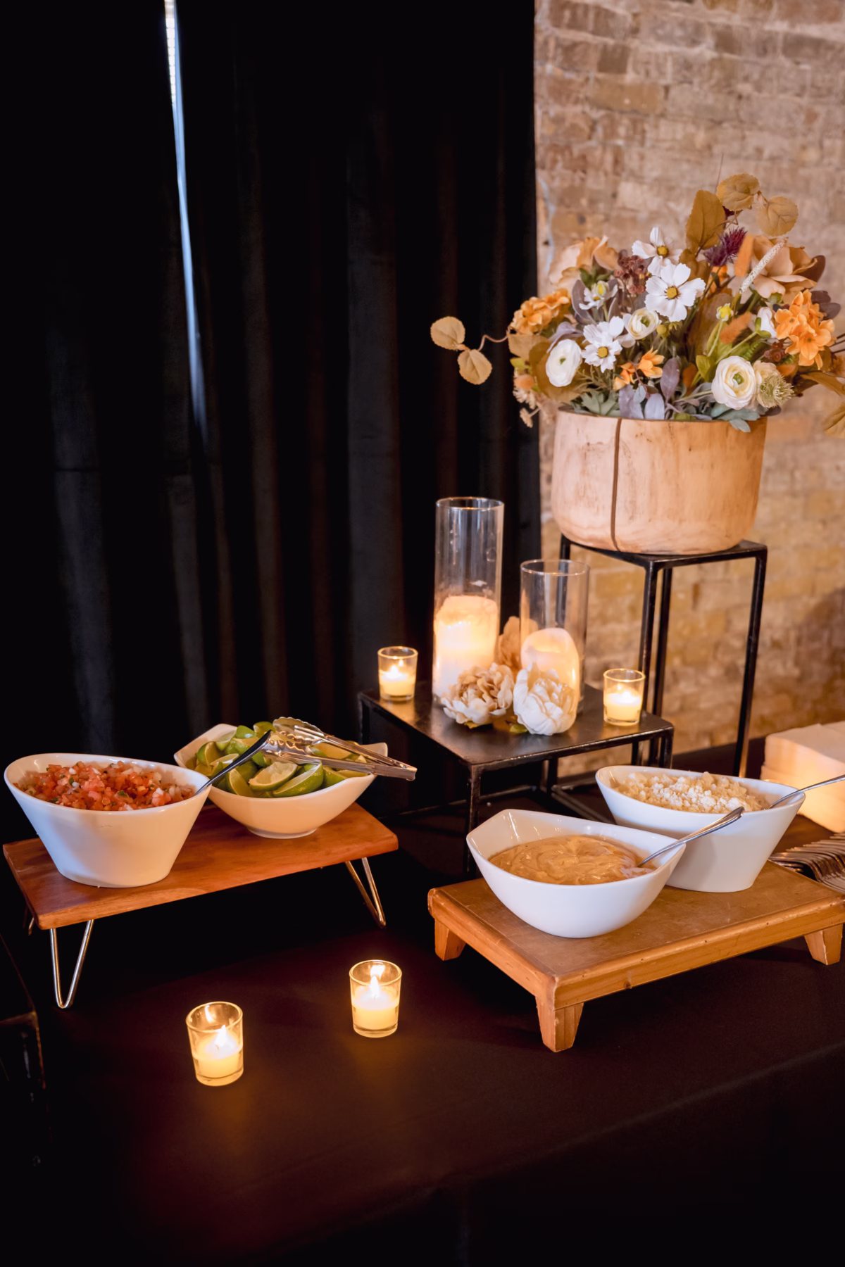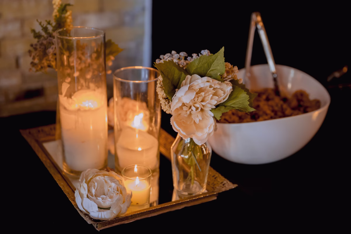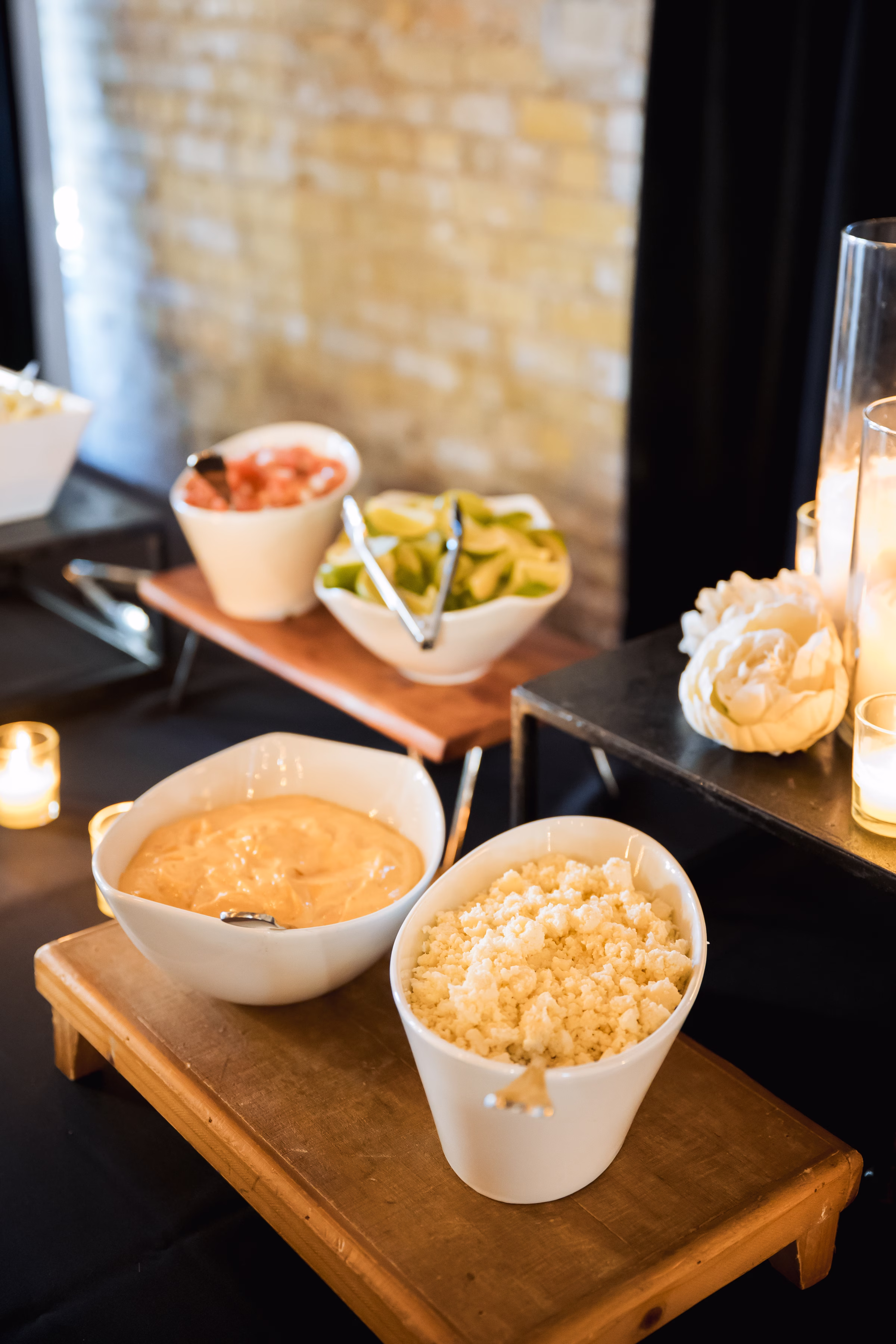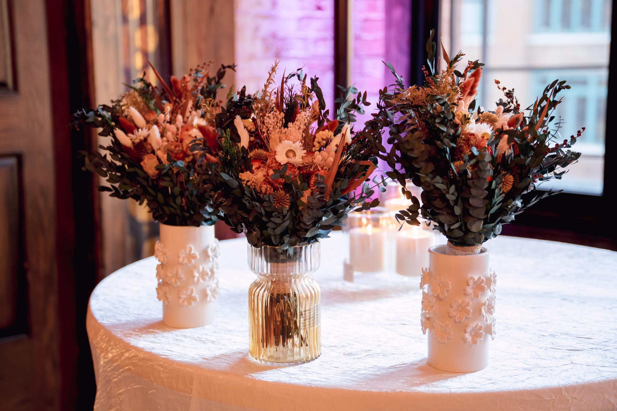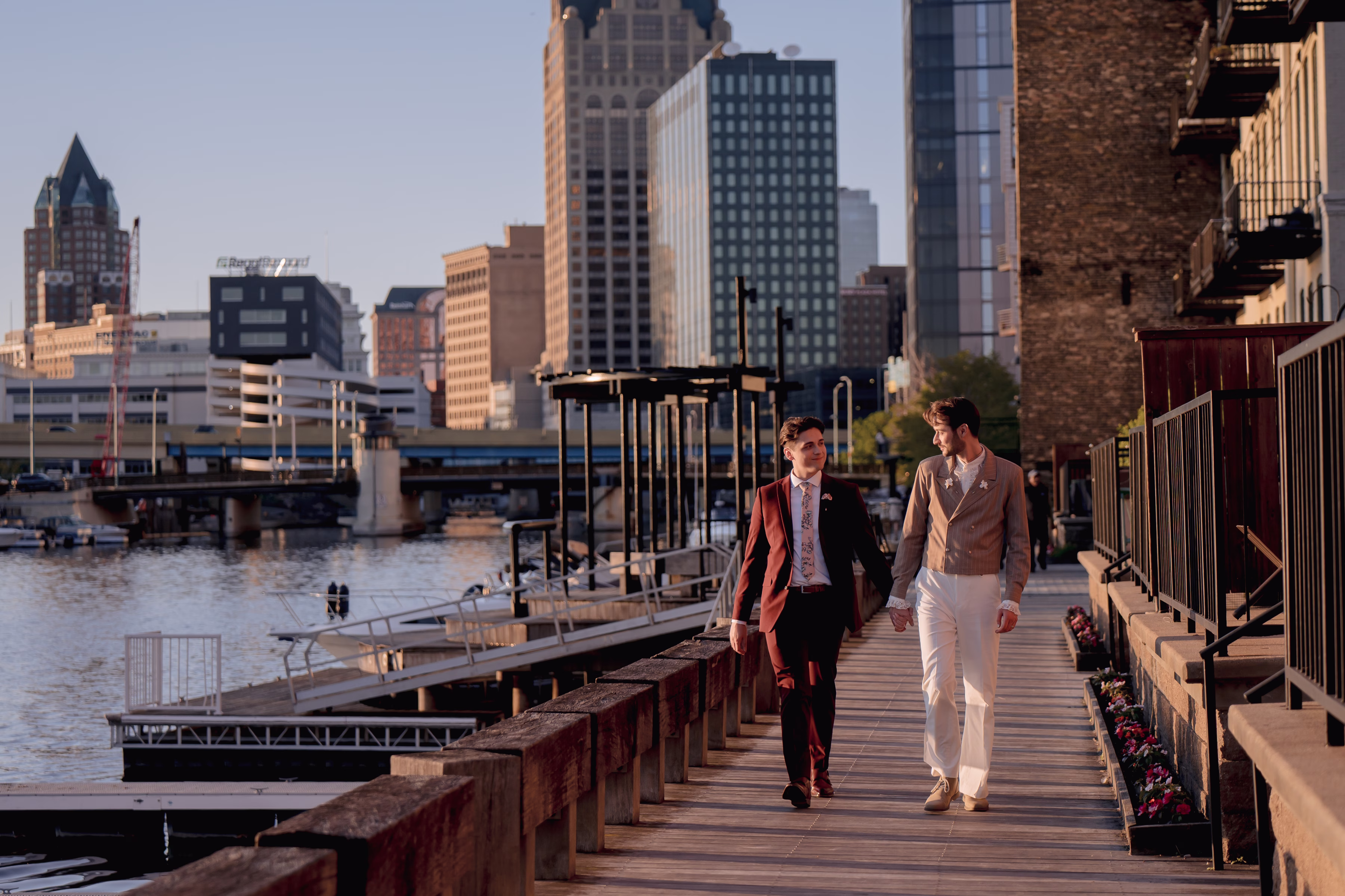 The wedding vision leaned vintage with wildflower elements and a subtle sense of drama, centered on a palette of ivory, tan, blush, and maroon. Tony and Jake chose The Loft on Broadway, a venue located in Milwaukee’s Historic First Ward, for their special day. The vintage, renovated industrial venue boasts large windows, high ceilings, wooden beams, and distinctive cream-city brick, making for a cozy space with cityscape views.