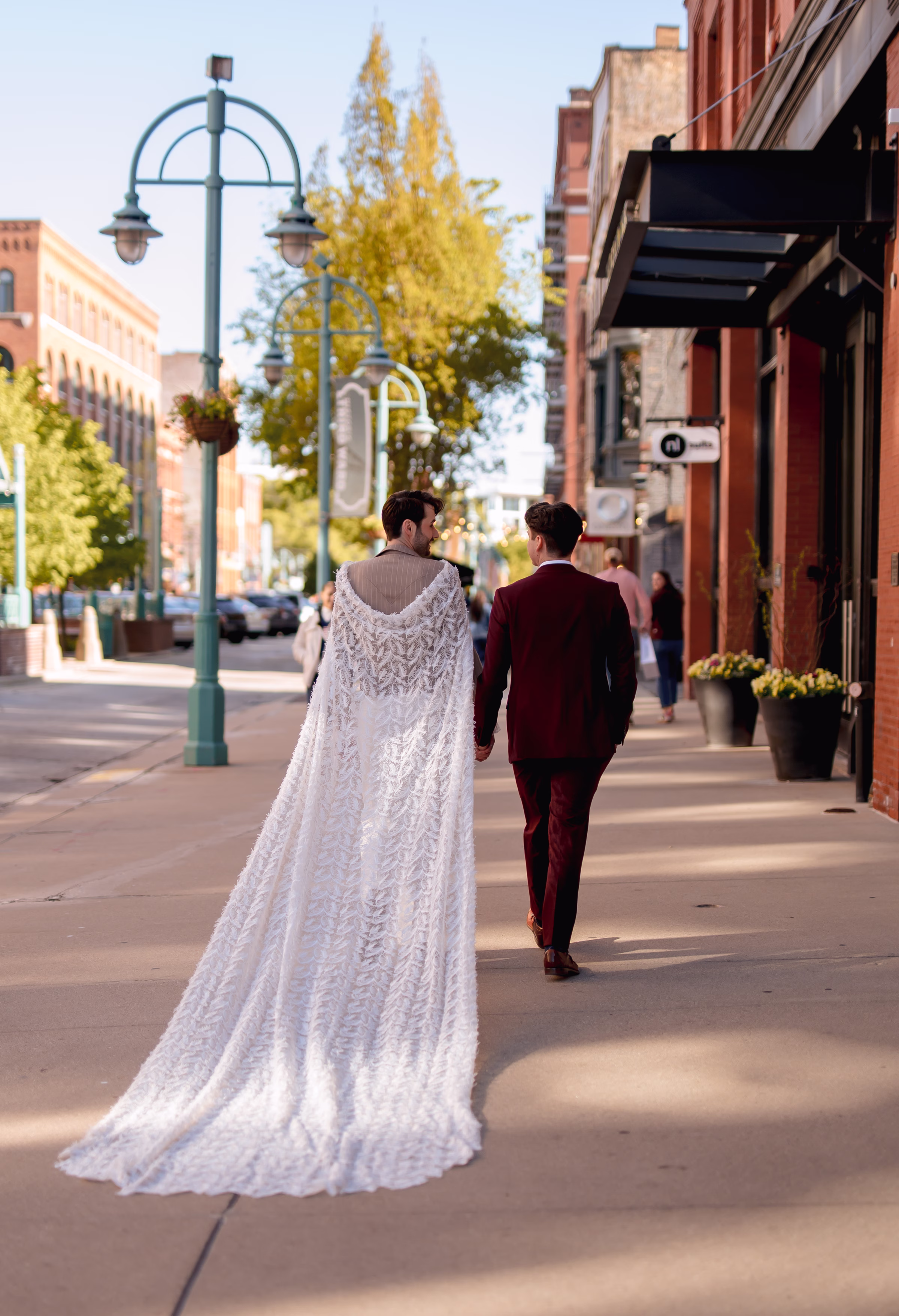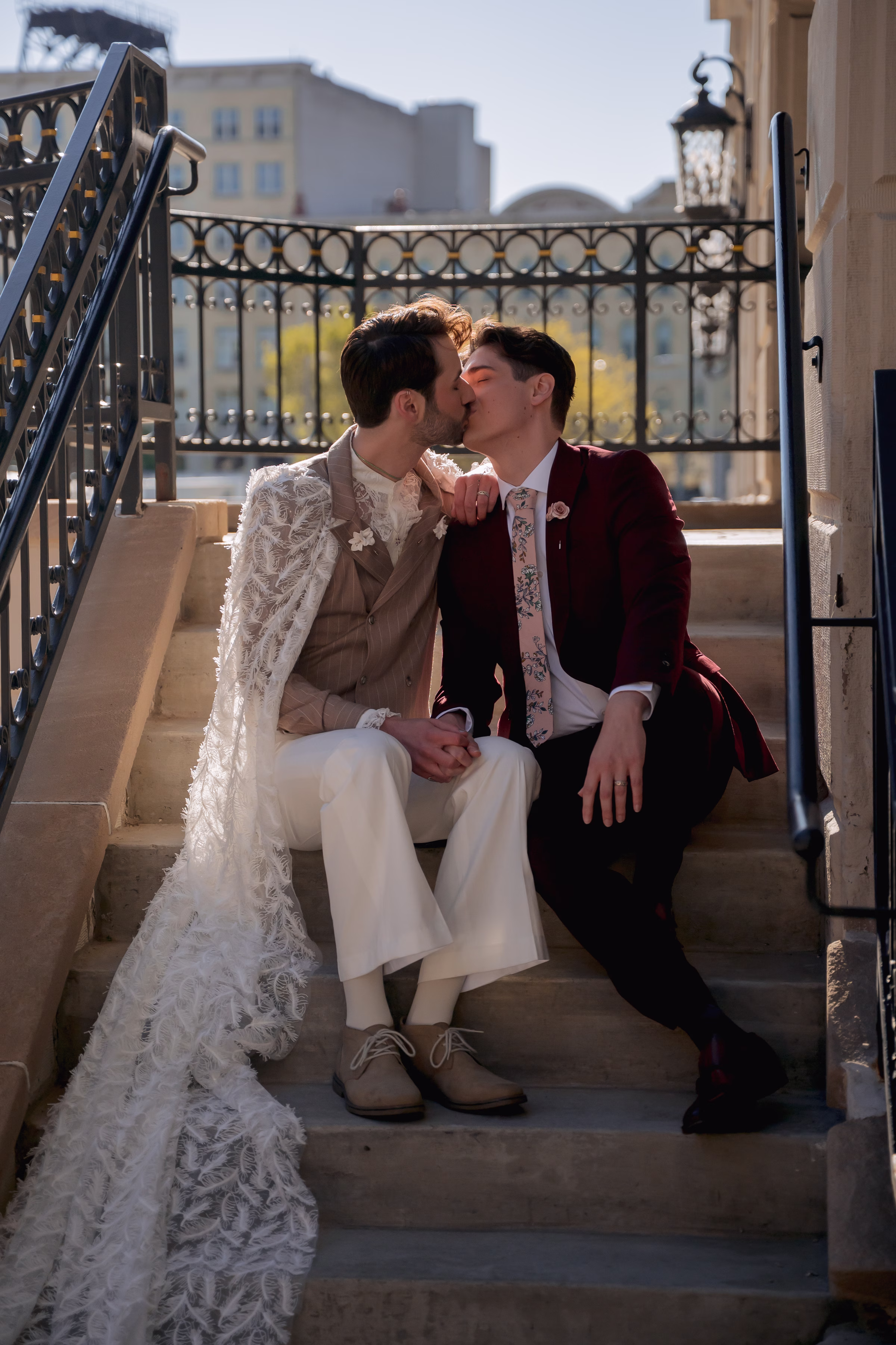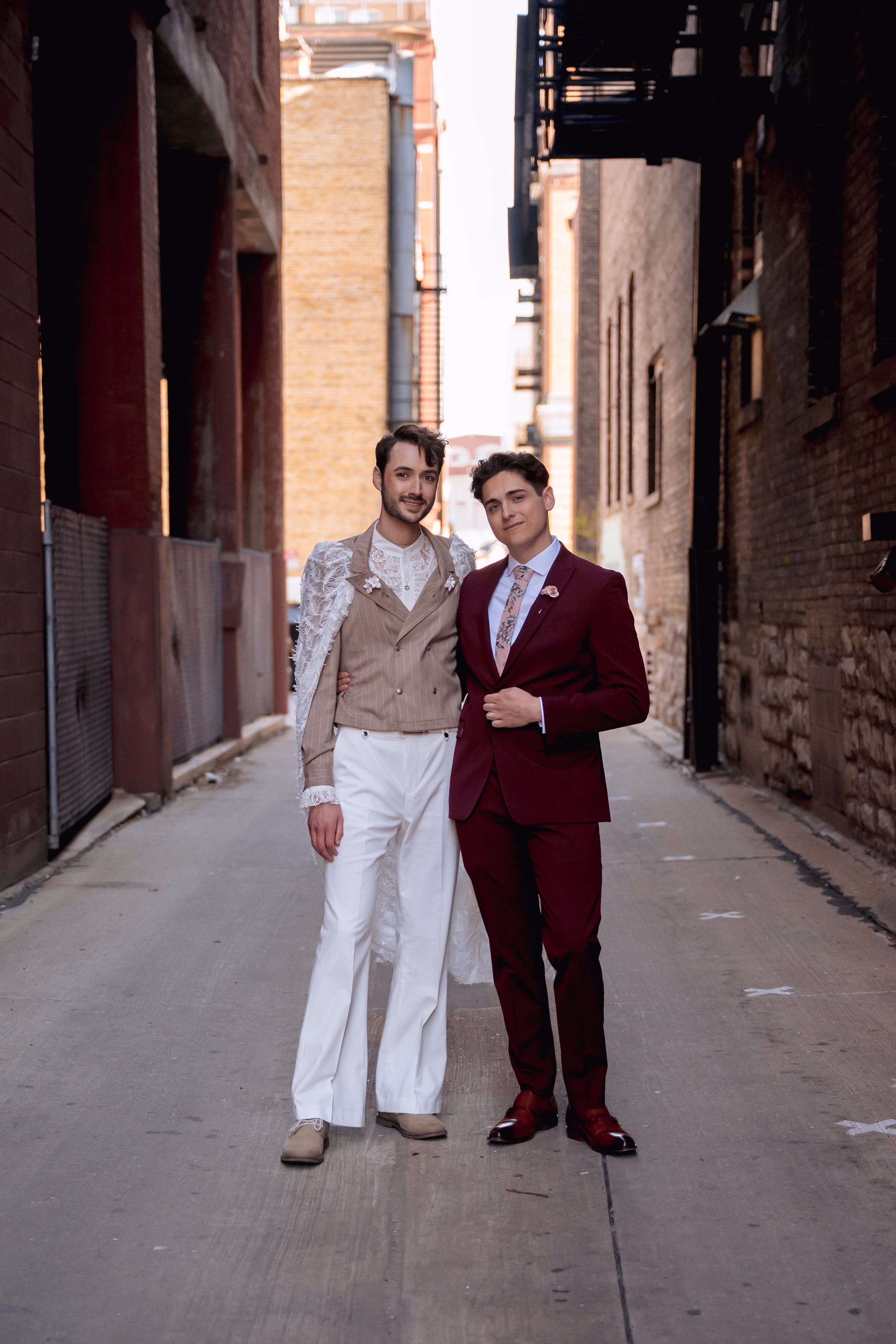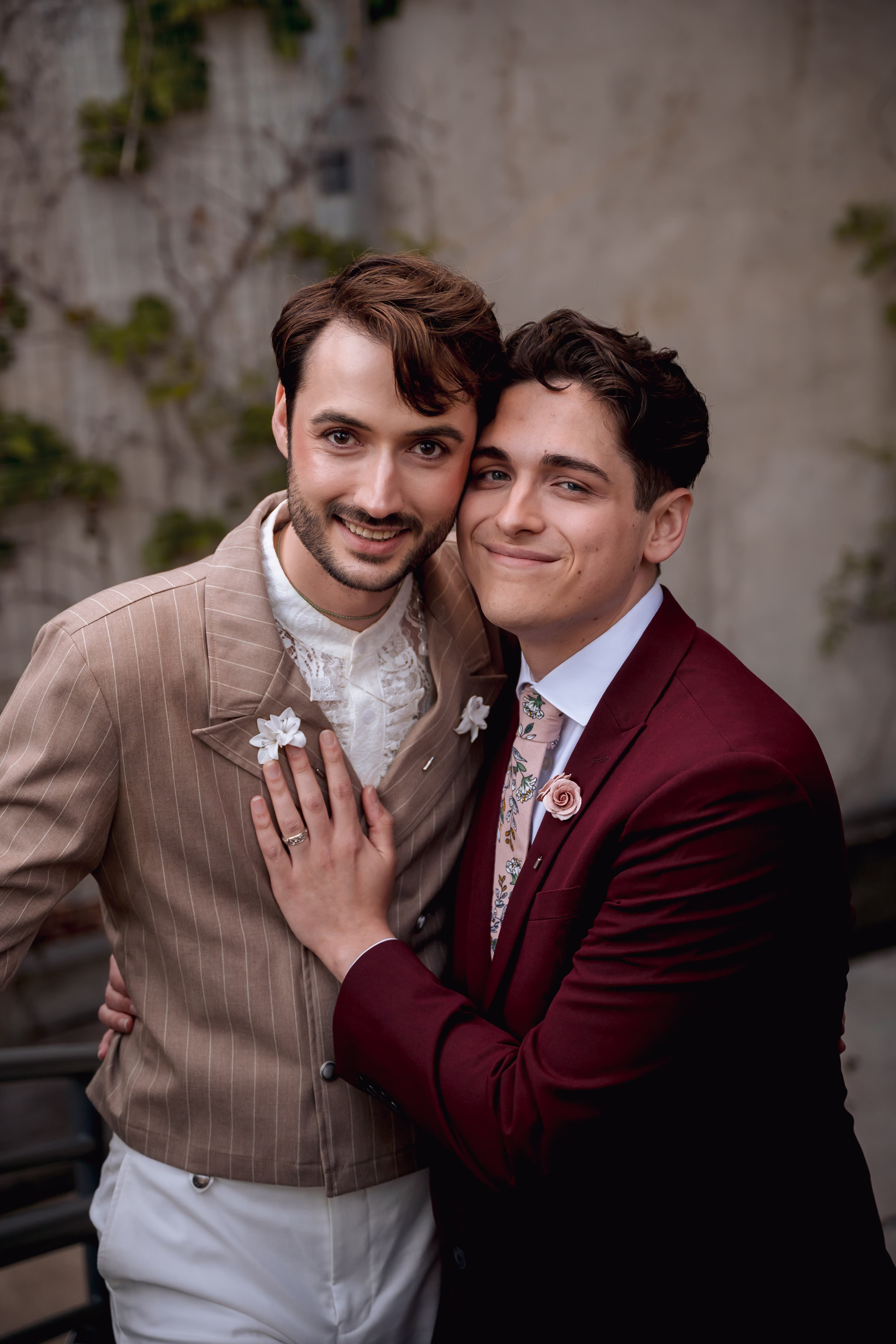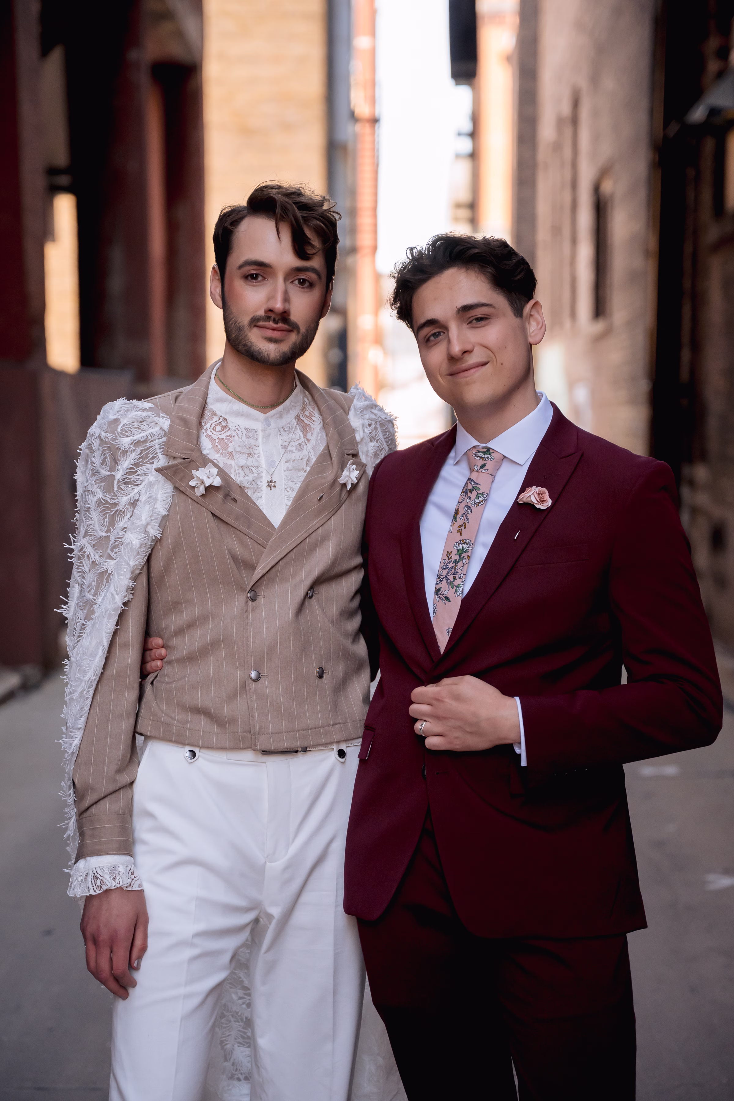 Tony wore a burgundy suit, with a crisp, white undershirt, and a blush-pattered tie that matched the color of his floral boutonniere. Jake wore white pants, a ruffle-and-lace-textured undershirt, and a tan pinstripe suit jacket. He accessorized with matching white boutonnieres on each lapel and a showstopping royal-length lace cape.