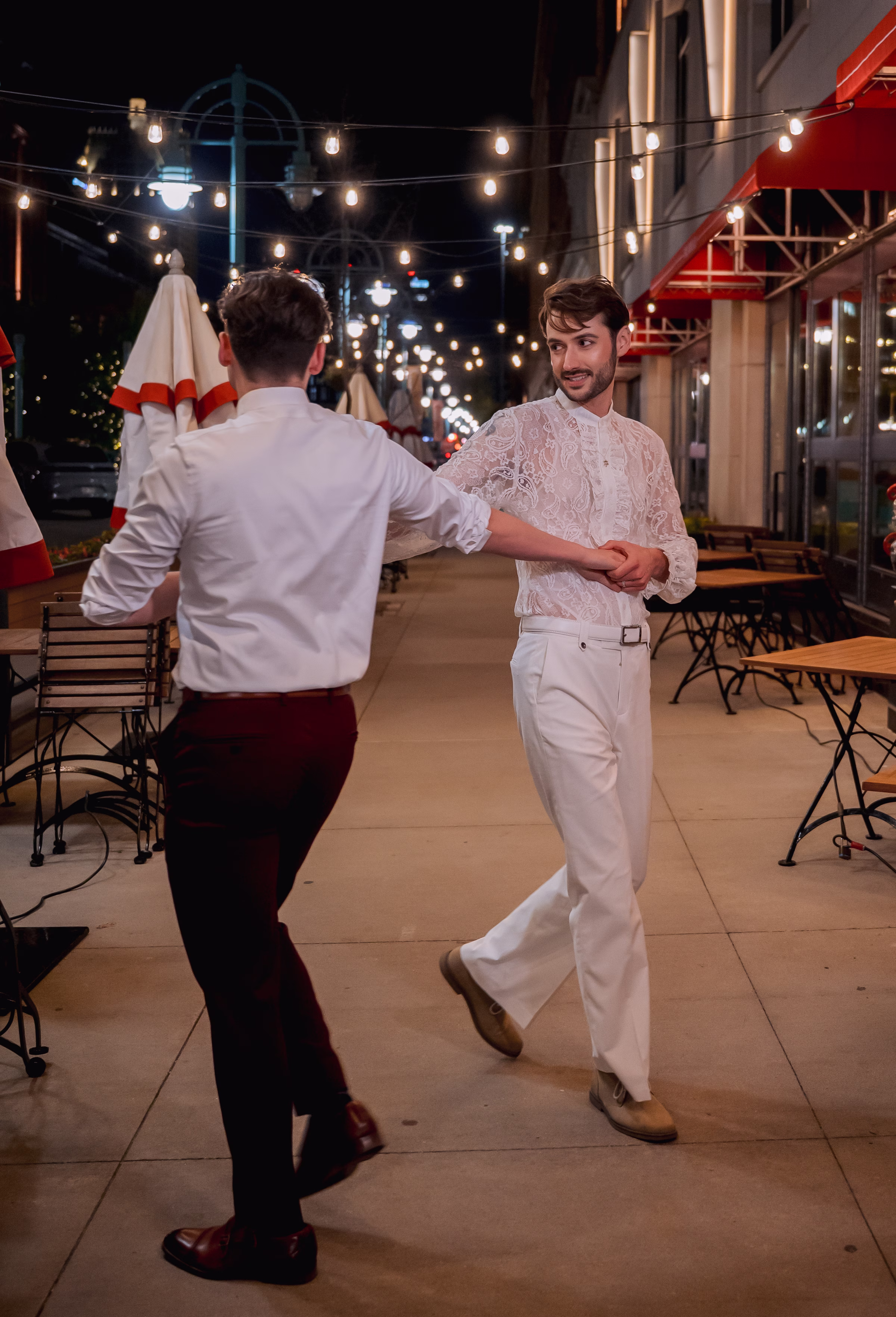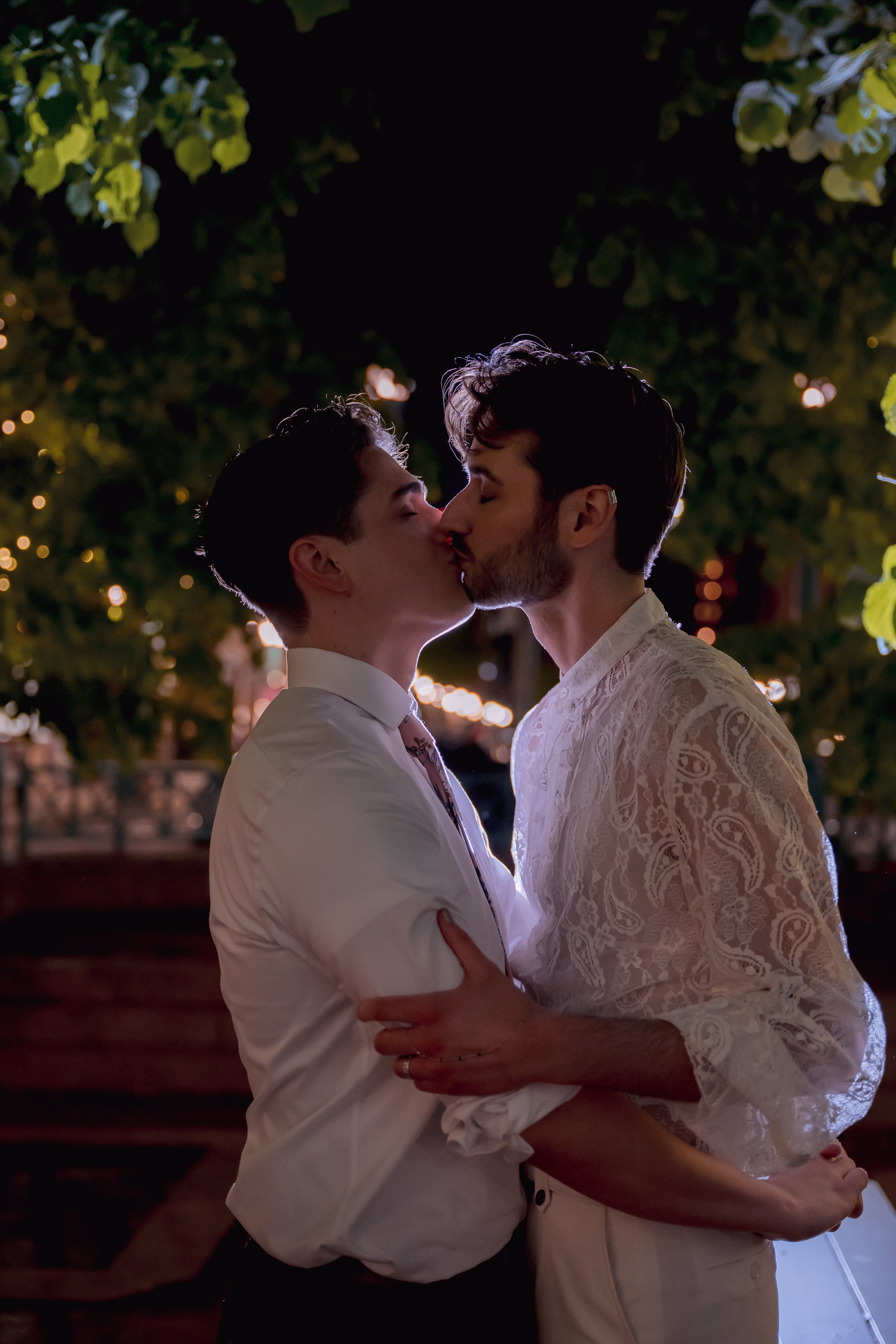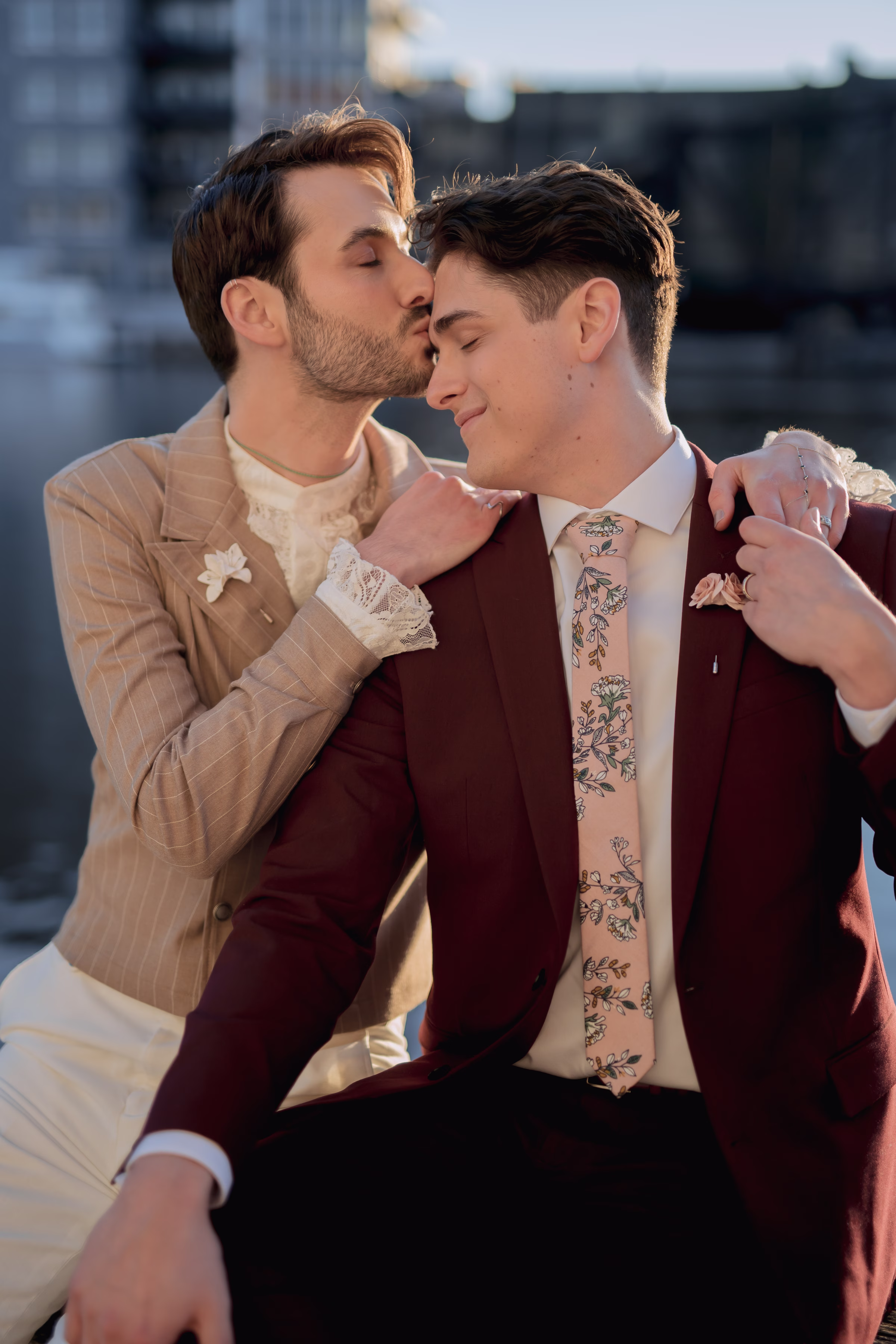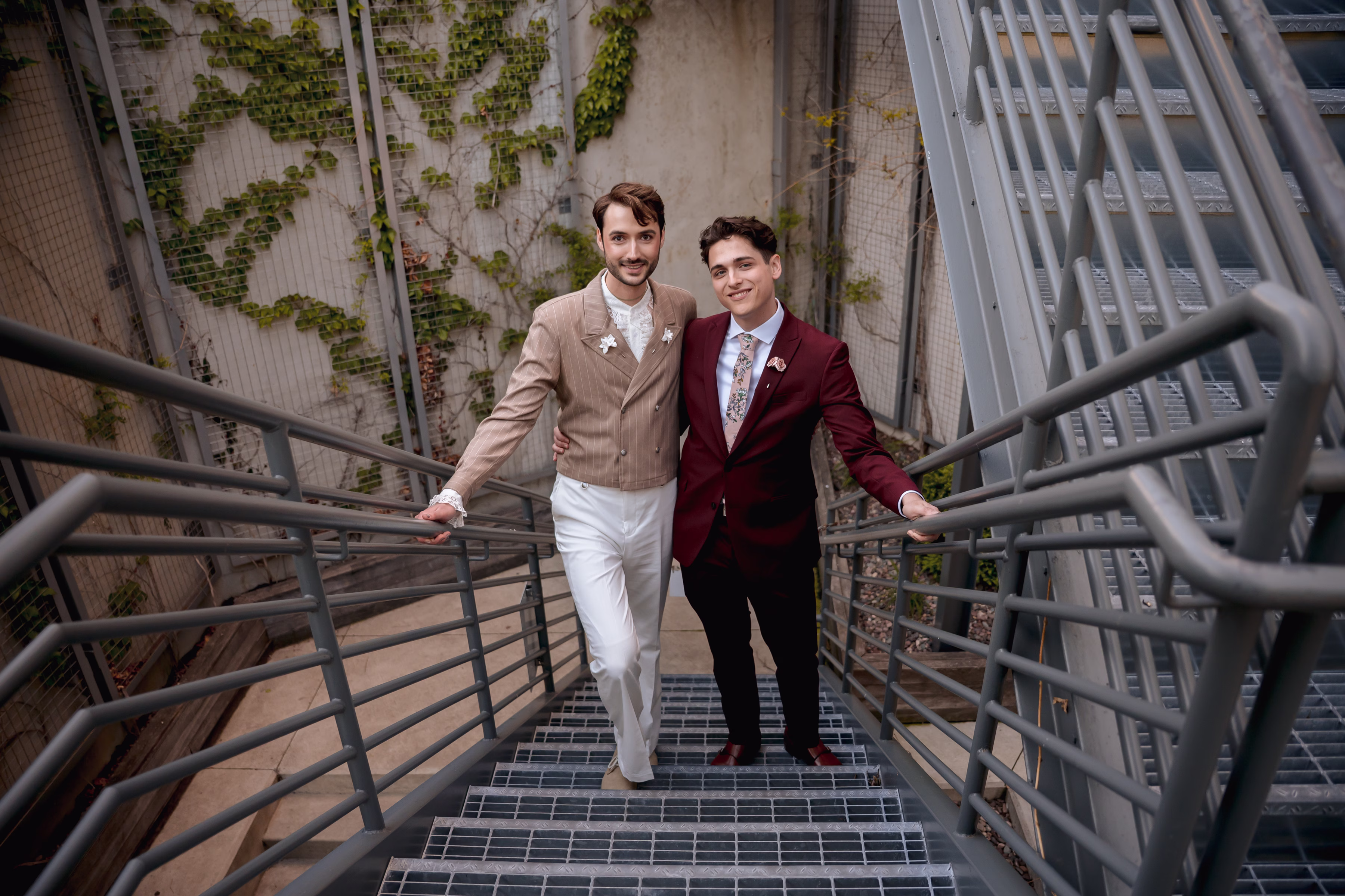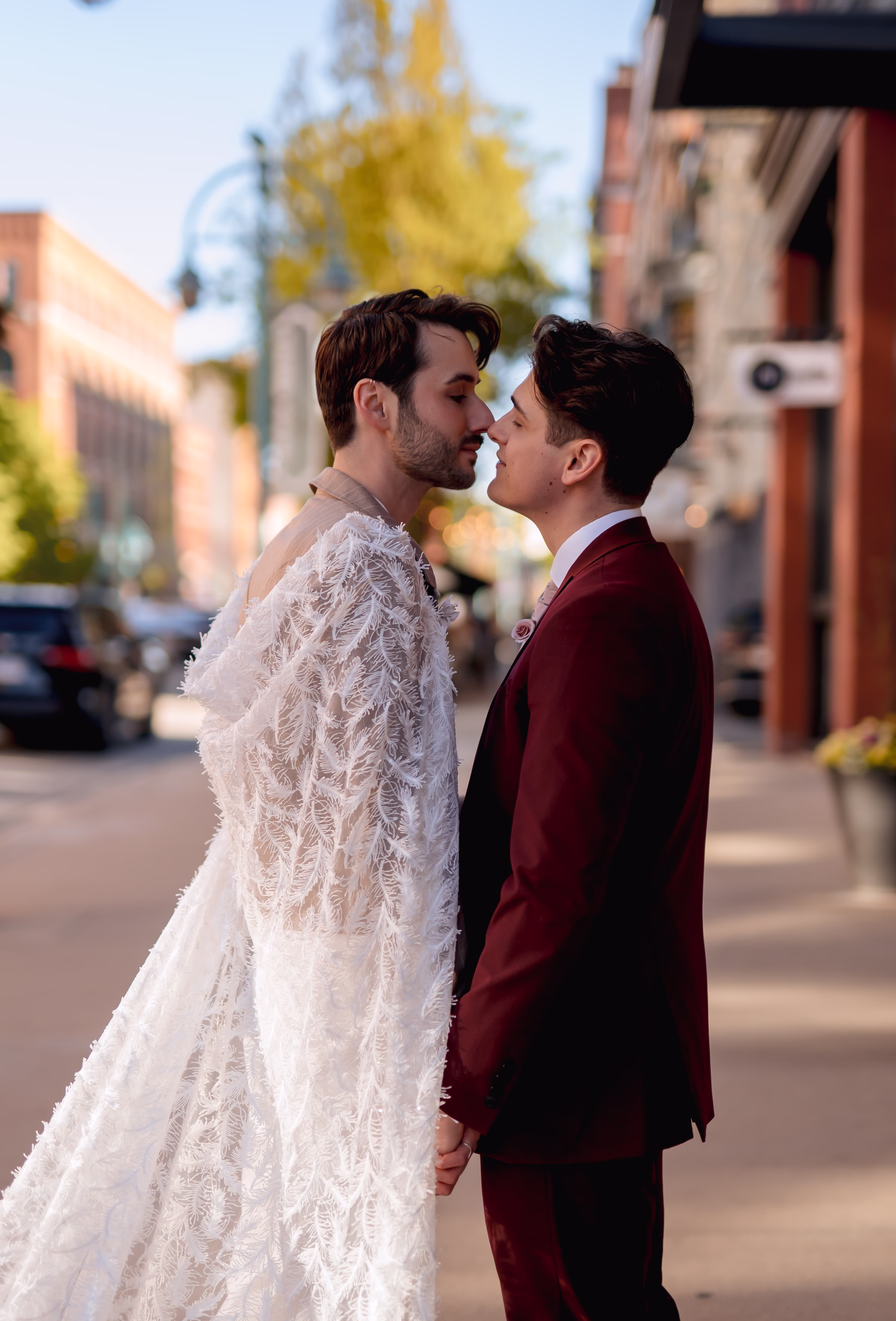 Tony wore a burgundy suit, with a crisp, white undershirt, and a blush-pattered tie that matched the color of his floral boutonniere. Jake wore white pants, a ruffle-and-lace-textured undershirt, and a tan pinstripe suit jacket. He accessorized with matching white boutonnieres on each lapel and a showstopping royal-length lace cape.