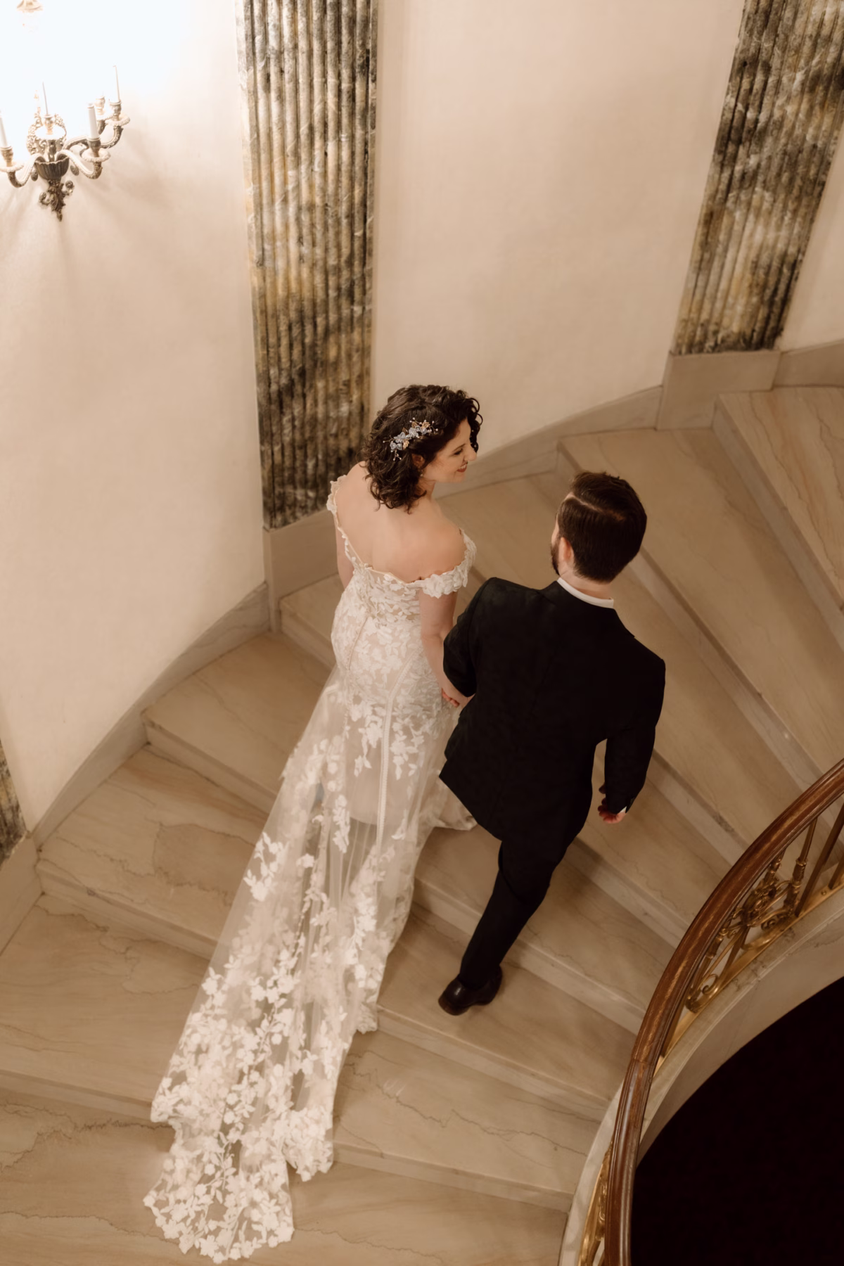Zoe wore a beautiful fit and flare bridal gown from Bliss Bridal LLC, featuring a romantic lace overlay over nude fabric, a plunging neckline, off-the-shoulder sleeves, and a sweeping train. Freya Salon sculpted effortlessly beautiful curls in her hair, secured on one side with a sparkling clip. Zoe’s makeup artist, Lisa, had the bride positively glowing, accentuating her eyes and lips without overpowering her natural beauty.